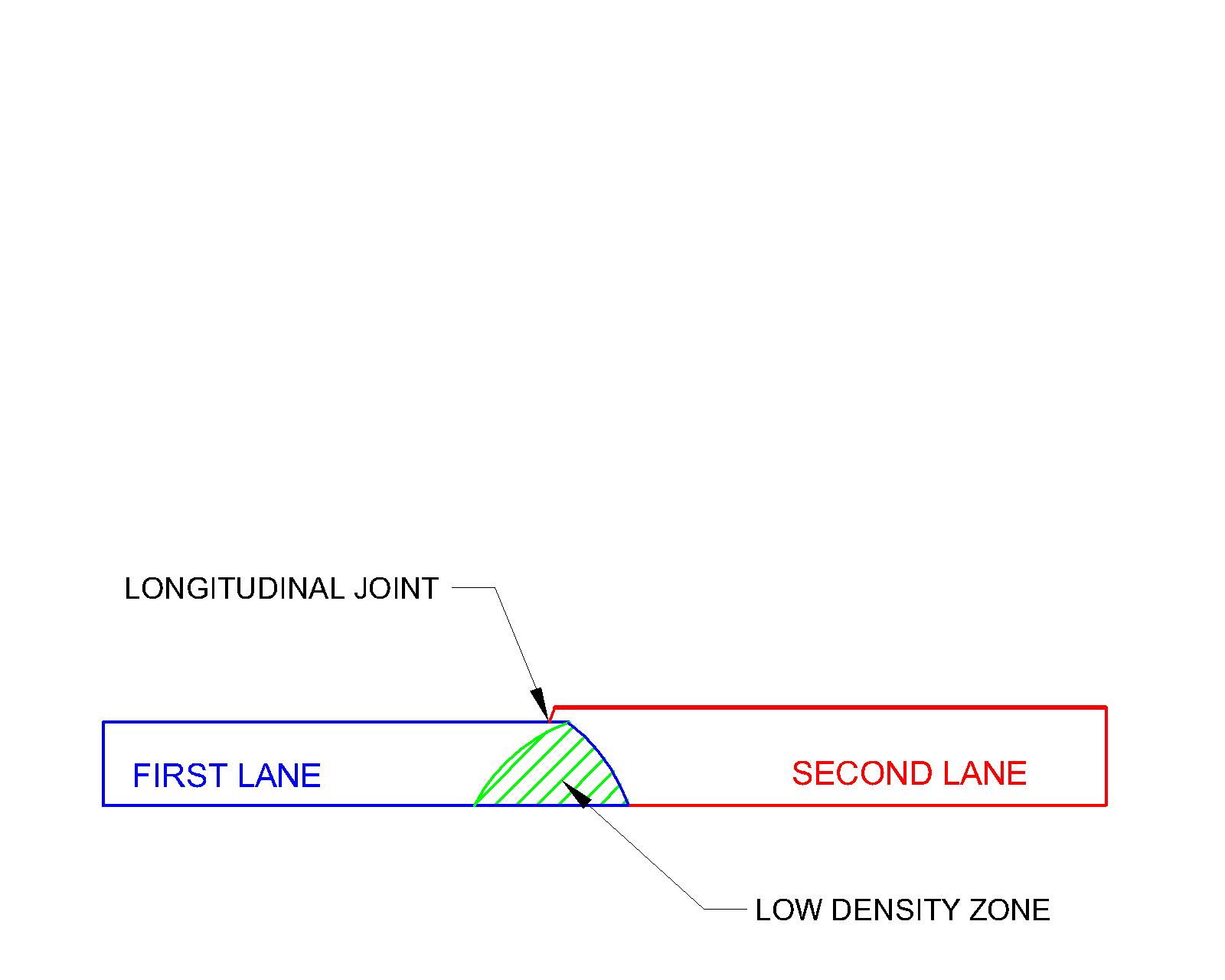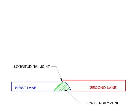The paving crew makes the second pass along the side of the first lane, which is where the area of low density is. This is what causes the joint to fail and deteriorate in a short period of time. The image below illustrates the location of the low density zone and where the longitudinal joint is formed.