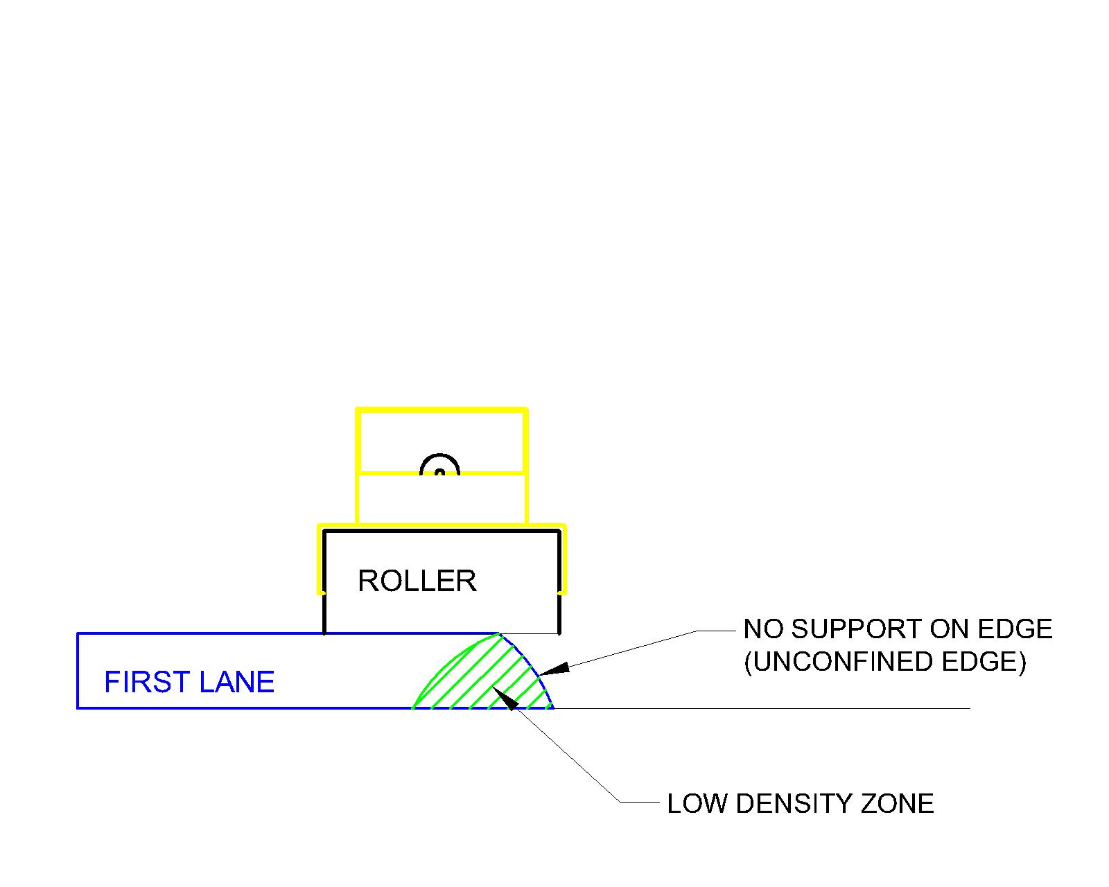 The most common reason for joint failure is due to low density at the joint. This is often due to the way a multi-lane roadway is paved with one lane being paved before the other. When the first lane is compacted with a roller there is an area at the edge of the paving mat that is not supported from the sides, this material will not receive adequate compaction and will not only be weaker than the surrounding pavement but it will also allow water to permeate through the surface, which allows for additional deterioration through freeze thaw cycles. The image below illustrates the unconfined edge under the roller.